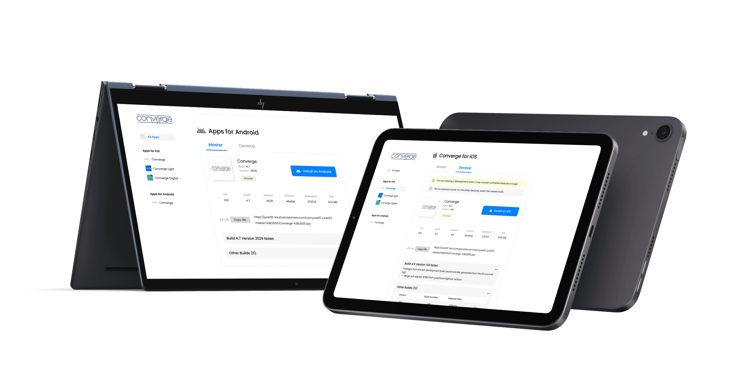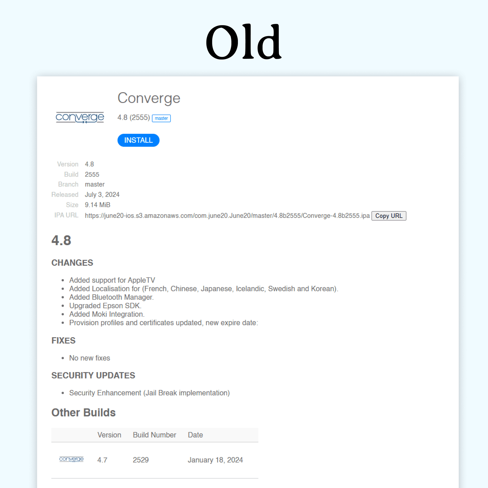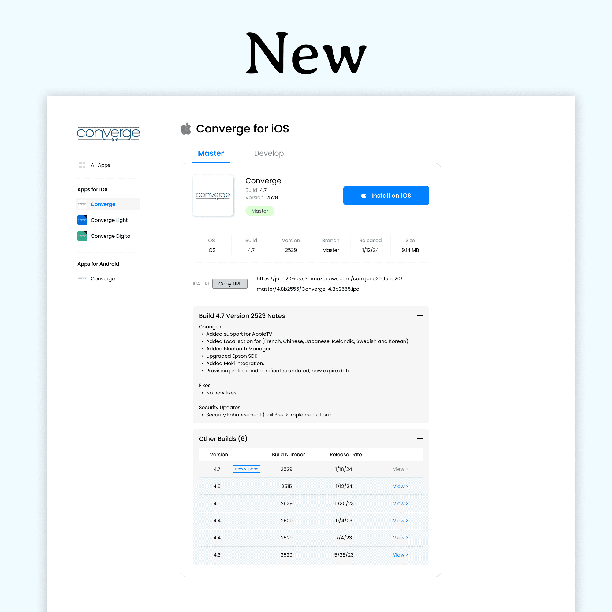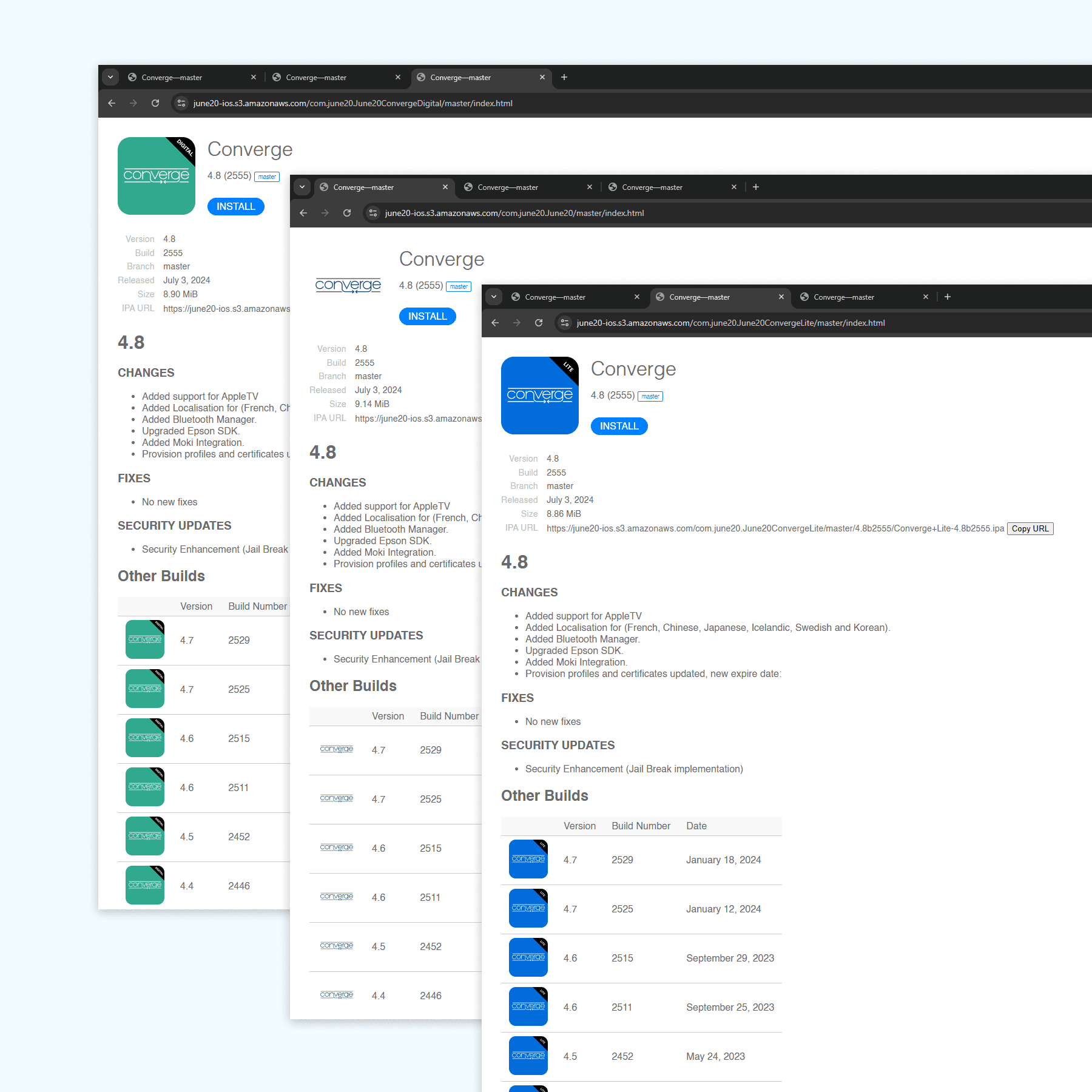 The existing system had separate pages for different app variants. Consolidating them into one interface required a flexible design that could handle multiple URLs, install buttons, and icons for iOS while maintaining a unified look.